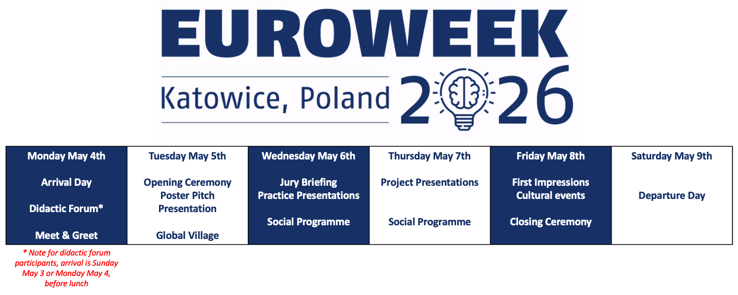 The Global Village at Euroweek 2026 will take place at/in XXXXX on Tuesday 5th of May 2026. It will start after pitch and poster presentation (see programme above).